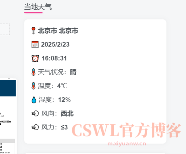 一款实时天气卡片html源码,可将代码嵌入自己的网站中,用户访问时会实时显示本机ip位置的天气。