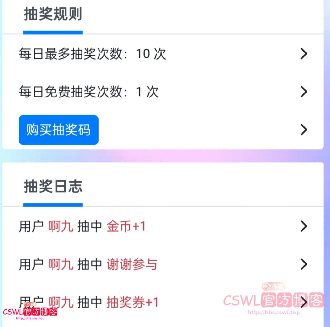 支持抽奖码功能,用户可在个人中心使用金币购买抽奖码及抽奖信息查看