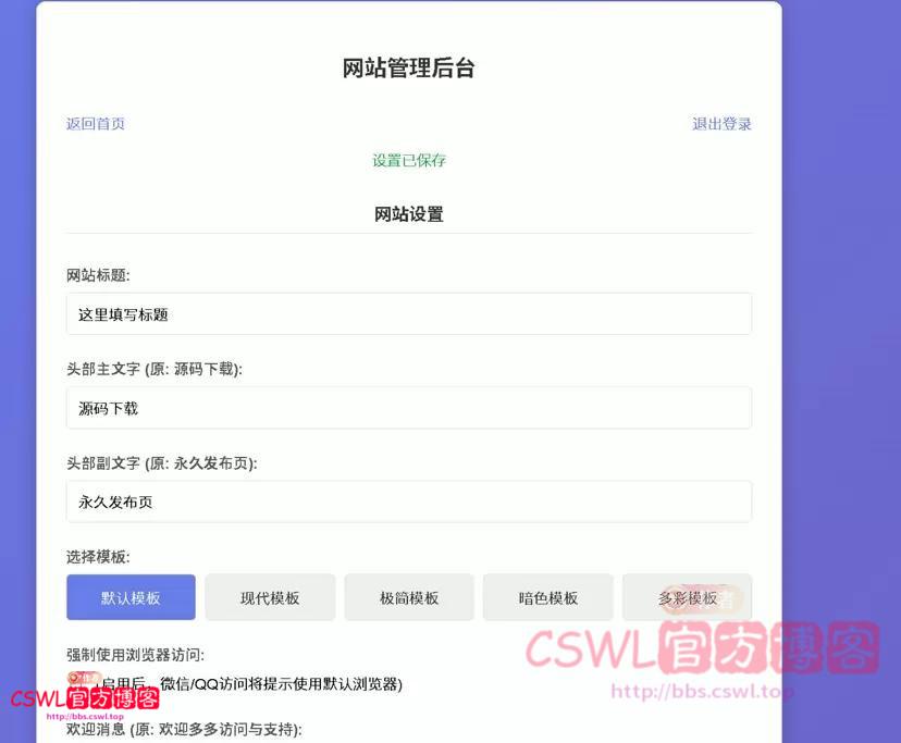 4:进入后台可编辑3个固定修改链接、添加或删除额外链接、设置底部文字及选择模板。